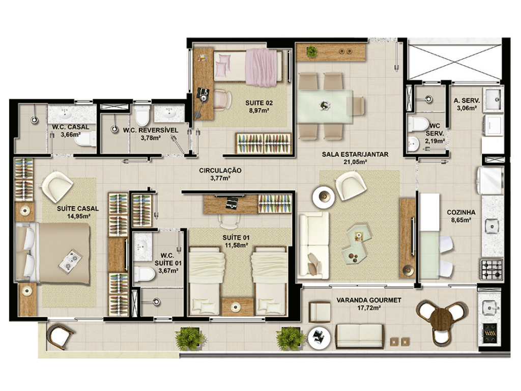- ÁREA PRIVATIVA Coluna 01: 99,95m² - Coluna 02 e 03: 103,05m² Coluna 04 e 05: 89,96m²